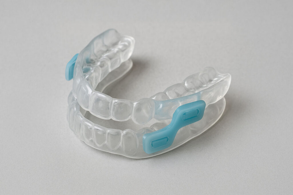 Die Schnarchschiene hält den Unterkiefer während des Schlafs leicht nach vorne. Dadurch bleiben die Atemwege offen, und das Schnarchen wird deutlich reduziert oder ganz verhindert.